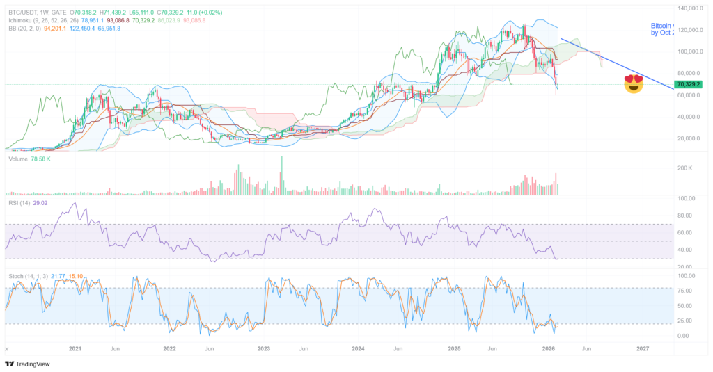 When in doubt, zoom out. Check for relevant pattterns: A head & shoulders confirmed and reaching its target value. Read the basic indicators: RSI, MACD, Stochastic, Ichimoku and Bollinger Bands. Capitulation volume? confirmed. All technicals seem oversold. Check the sentiment.The retail is gone. The institutions? are there any moral or regulatory shocks? Yes. Like towards the bottom of the previous bearmarket and the scandals surrounding the FTX exchange & Luna token price inflation scheme, the Jeffrey Epstein saga of late 2025 to early 2026 and scandals surrounding the Trump administration’s insider trading schemes are impacting the regulatory environment. Hence, Western institutions have put their crypto portfolios on hold. Scandals around popular stablecoins, such as Tether are bubbling under with accusations of connections to off the books proliferation of U.S. treasuries.