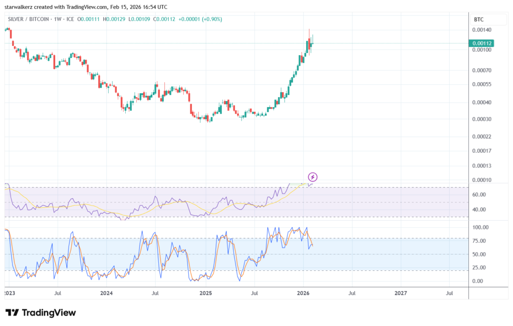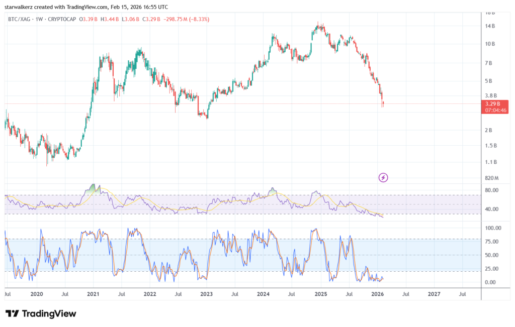 On the flipside, Bitcoin’s market cap measured in silver seems to be forming a capitulation bottom with a clear downward hockey stick and exhaustion candles in the first two weeks of February 2026, oversold RSI and Stochastic below the lower band indicating bullish momentum returning in the near future.
